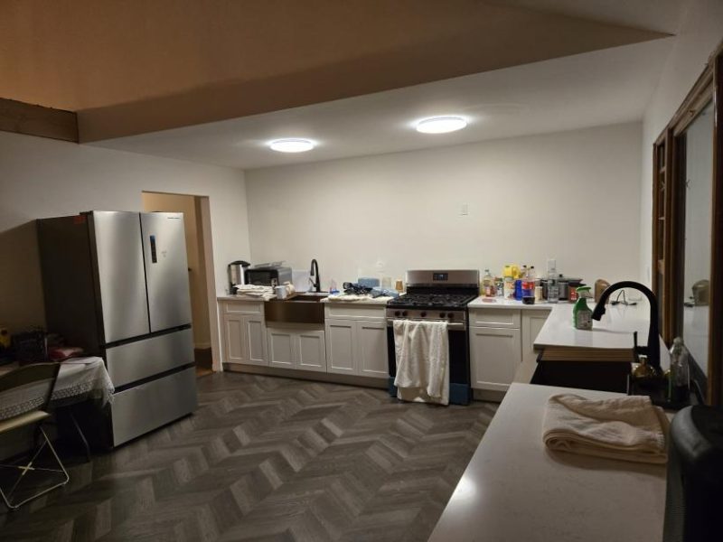 – Cholov Yisroel side: stovetop, sink, dishwasher, toaster-oven/microwave, Beatty-Crocker, Keurig, pots/pans, cooking utensils, dishes and cutlery for 6.